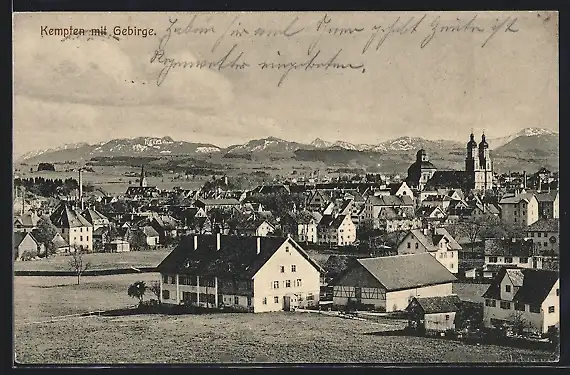 AK Kempten / Allgäu, Teilansicht mit Kirche und Gebirge