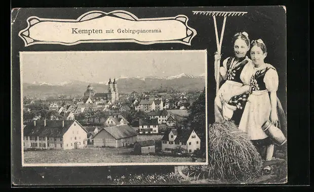 AK Kempten, Ortsansicht mit Gebirgspanorama, Bäuerinnen in Tracht