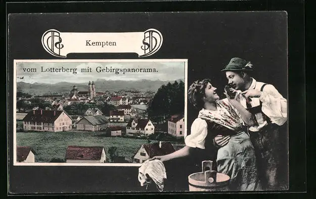 AK Kempten, Ortsansicht vom Lotterberg mit Gebirgspanorama und Paar in Tracht