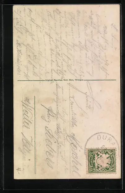 Personenbezogene Daten auf der Rückseite der Karte wurden durch blauen Textmarker unkenntlich gemacht. Die blauen Stellen sind auf die Vorderseite durchgeweicht und wirken sich negativ auf das Postkartenfoto aus