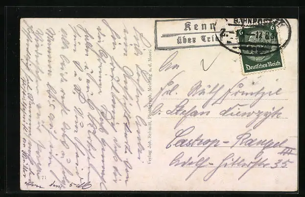 gelaufen 1937, kleiner Einriss links mittig, guter Zustand