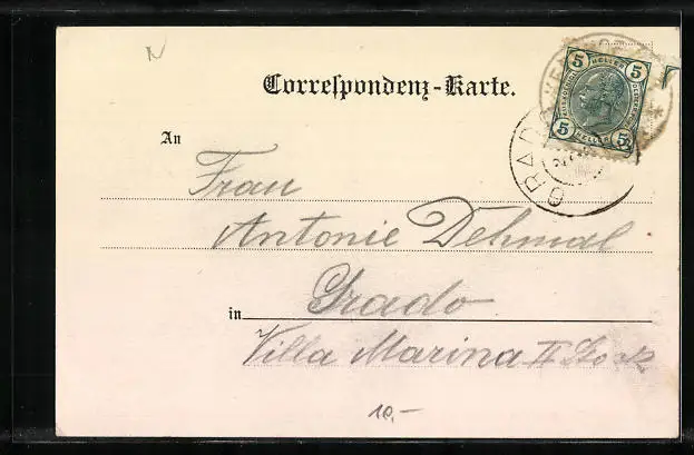 Personenbezogene Daten auf der Rückseite der Karte wurden durch blauen Textmarker unkenntlich gemacht. Die blauen Stellen sind auf die Vorderseite durchgeweicht und wirken sich negativ auf das Postkartenfoto aus
