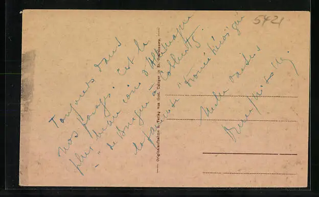 Personenbezogene Daten auf der Rückseite der Karte wurden durch blauen Textmarker unkenntlich gemacht. Die blauen Stellen sind auf die Vorderseite durchgeweicht und wirken sich negativ auf das Postkartenfoto aus