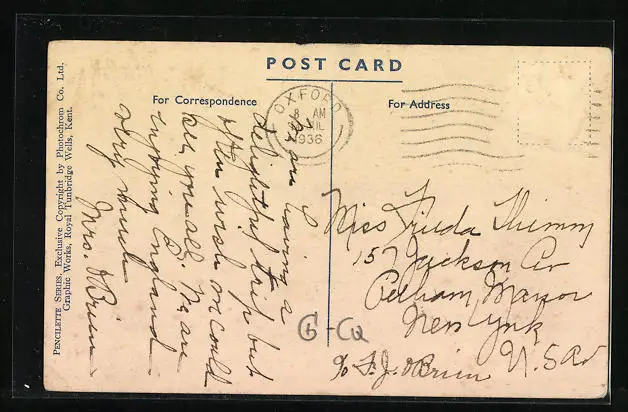 Personenbezogene Daten auf der Rückseite der Karte wurden durch blauen Textmarker unkenntlich gemacht. Die blauen Stellen sind auf die Vorderseite durchgeweicht und wirken sich negativ auf das Postkartenfoto aus