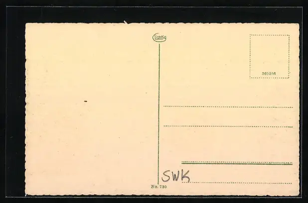 Personenbezogene Daten auf der Rückseite der Karte wurden durch blauen Textmarker unkenntlich gemacht. Die blauen Stellen sind auf die Vorderseite durchgeweicht und wirken sich negativ auf das Postkartenfoto aus