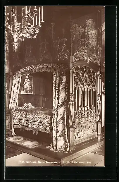 AK Kgl. Schloss Neuschwanstein, Bett im Schlafzimmer