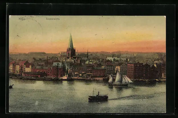 AK Kiel, Ansicht mit Segelboot und Dampfschiff