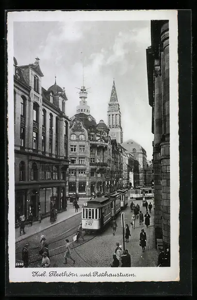 AK Kiel, Fleethörn und Rathausturm, Strassenbahn