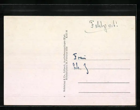 Personenbezogene Daten auf der Rückseite der Karte wurden durch blauen Textmarker unkenntlich gemacht. Die blauen Stellen sind auf die Vorderseite durchgeweicht und wirken sich negativ auf das Postkartenfoto aus