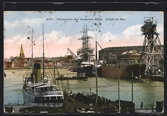 AK Kiel, Hafenpartie mit Germaniawerft. Schiffe im Bau
