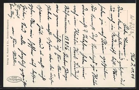 Personenbezogene Daten auf der Rückseite der Karte wurden durch blauen Textmarker unkenntlich gemacht. Die blauen Stellen sind auf die Vorderseite durchgeweicht und wirken sich negativ auf das Postkartenfoto aus