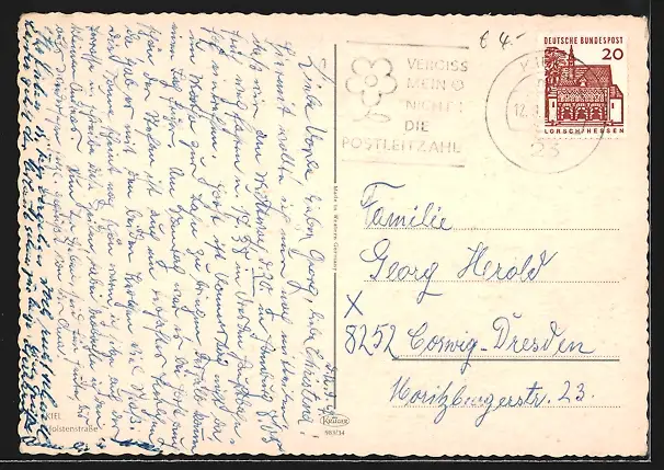 Personenbezogene Daten auf der Rückseite der Karte wurden durch blauen Textmarker unkenntlich gemacht. Die blauen Stellen sind auf die Vorderseite durchgeweicht und wirken sich negativ auf das Postkartenfoto aus