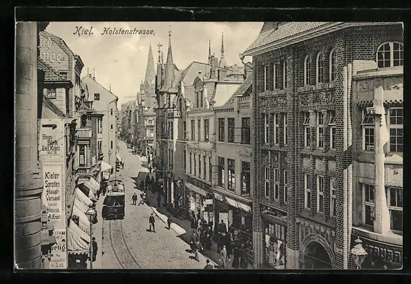 AK Kiel, Holstenstrasse mit Geschäften und Strassenbahn