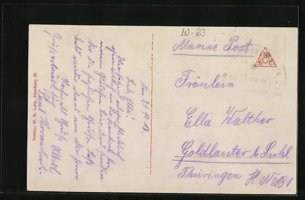 Personenbezogene Daten auf der Rückseite der Karte wurden durch blauen Textmarker unkenntlich gemacht. Die blauen Stellen sind auf die Vorderseite durchgeweicht und wirken sich negativ auf das Postkartenfoto aus