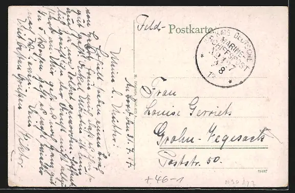 Personenbezogene Daten auf der Rückseite der Karte wurden durch blauen Textmarker unkenntlich gemacht. Die blauen Stellen sind auf die Vorderseite durchgeweicht und wirken sich negativ auf das Postkartenfoto aus