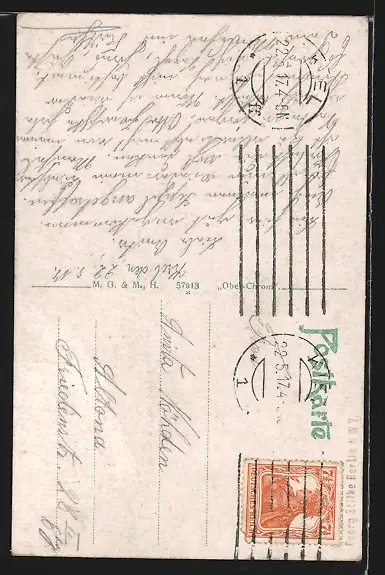 Personenbezogene Daten auf der Rückseite der Karte wurden durch blauen Textmarker unkenntlich gemacht. Die blauen Stellen sind auf die Vorderseite durchgeweicht und wirken sich negativ auf das Postkartenfoto aus