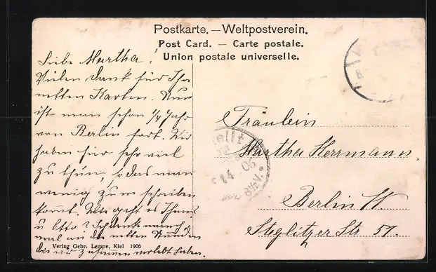 alte Ansichtskarte, gelaufen 1906, Briefmarke entfernt, rückseitig Oberflächenschaden, Eckknicke oben, guter Zustand