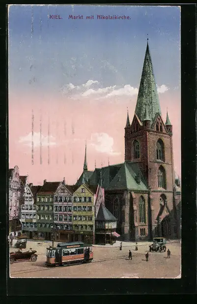 AK Kiel, Strassenbahn auf dem Markt mit Nikolaikirche