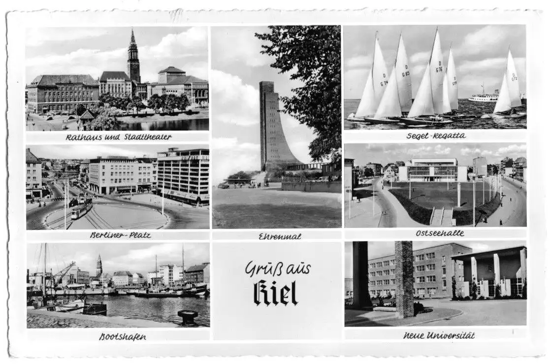 Ansichtskarte Kiel sieben Abb. - Rathaus und Stadttheater, Segelregatta, Berliner Platz, Ehrenmal, Ostseehalle, Bootshafen, Neue Universität Erhaltung I-II postalisch gelaufen, gestempelt: (24b) Kiel 1, 10.1.59 Verlag: Schöning & Co., Lübeck