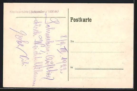 Personenbezogene Daten auf der Rückseite der Karte wurden durch blauen Textmarker unkenntlich gemacht. Die blauen Stellen sind auf die Vorderseite durchgeweicht und wirken sich negativ auf das Postkartenfoto aus