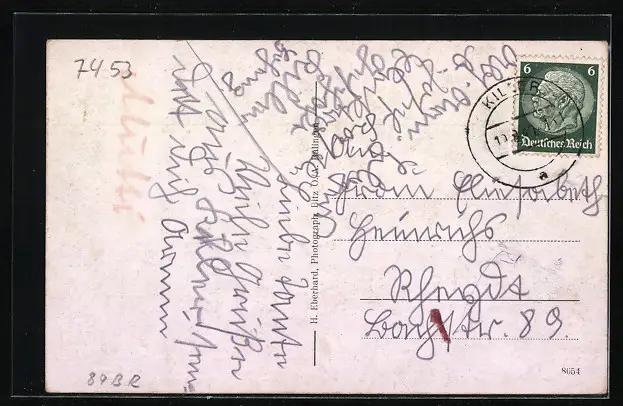 Personenbezogene Daten auf der Rückseite der Karte wurden durch blauen Textmarker unkenntlich gemacht. Die blauen Stellen sind auf die Vorderseite durchgeweicht und wirken sich negativ auf das Postkartenfoto aus