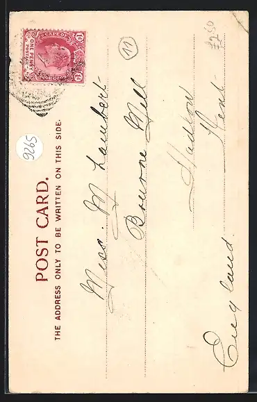 Personenbezogene Daten auf der Rückseite der Karte wurden durch blauen Textmarker unkenntlich gemacht. Die blauen Stellen sind auf die Vorderseite durchgeweicht und wirken sich negativ auf das Postkartenfoto aus