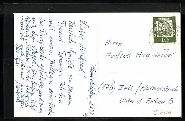 Personenbezogene Daten auf der Rückseite der Karte wurden durch blauen Textmarker unkenntlich gemacht. Die blauen Stellen sind auf die Vorderseite durchgeweicht und wirken sich negativ auf das Postkartenfoto aus