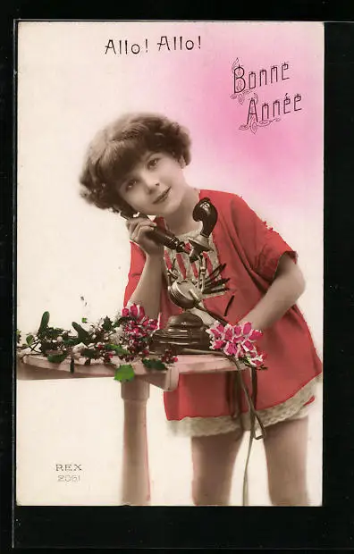 AK Kind am Telefon mit Kätzchenzweig, Neujahrsgruss