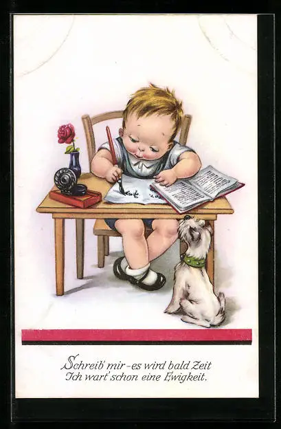 AK Kind am Tisch schreibt einen Brief, Schreibfaul