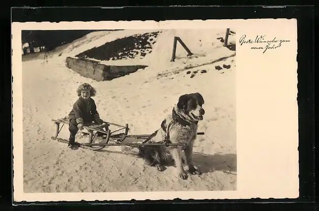 AK Kind auf Rodelschlitten, von Bernhardiner gezogen, Neujahrsgruss