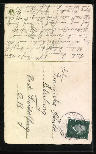 Personenbezogene Daten auf der Rückseite der Karte wurden durch blauen Textmarker unkenntlich gemacht. Die blauen Stellen sind auf die Vorderseite durchgeweicht und wirken sich negativ auf das Postkartenfoto aus