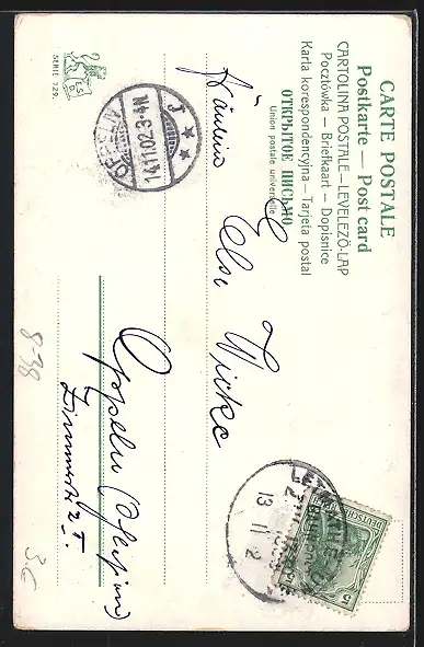 alte Ansichtskarte, gelaufen 1902, Eckknick re. oben, guter Zustand