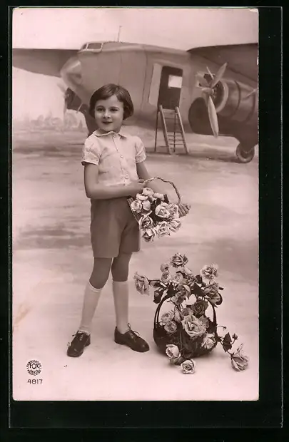 AK Kind mit Blumenkorb vor Studikulisse mit Passagierflugzeug