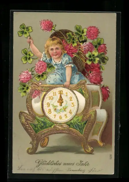 AK Kind mit Kleeblatt und Uhr zu Mitternacht