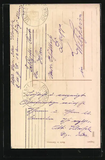 Personenbezogene Daten auf der Rückseite der Karte wurden durch blauen Textmarker unkenntlich gemacht. Die blauen Stellen sind auf die Vorderseite durchgeweicht und wirken sich negativ auf das Postkartenfoto aus