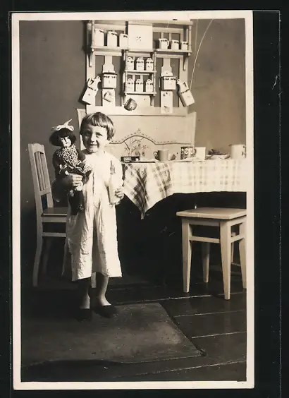 AK Kind mit Puppe am Frühstückstisch
