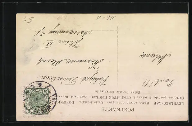 Personenbezogene Daten auf der Rückseite der Karte wurden durch blauen Textmarker unkenntlich gemacht. Die blauen Stellen sind auf die Vorderseite durchgeweicht und wirken sich negativ auf das Postkartenfoto aus