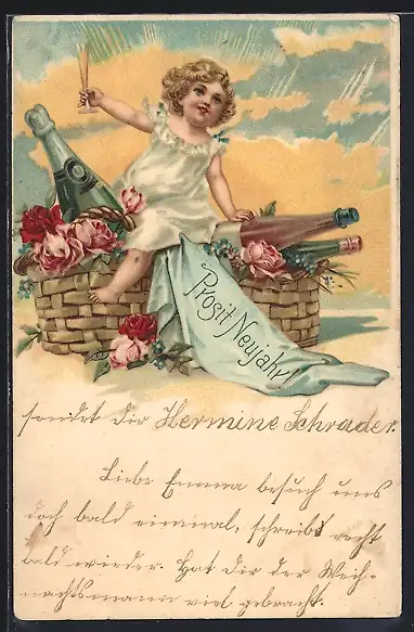 AK Kind mit Sektkorb stösst zu Neujahr an