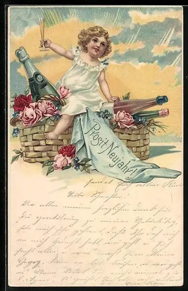 AK Kind mit Sektkorb stösst zu Neujahr an