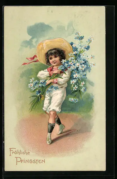 AK Kind mit Vergissmeinnicht zu Pfingsten