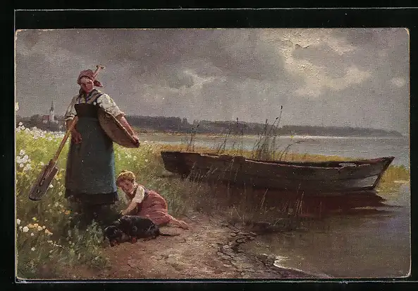 AK Kind streichelt einen Dackel, Bäuerin