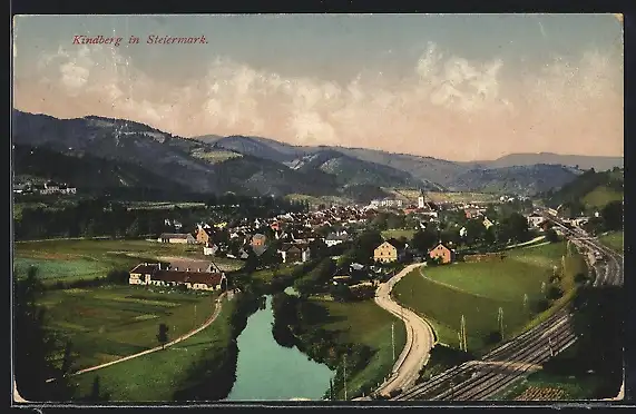 AK Kindberg, Ortspartie am Fluss aus der Vogelschau