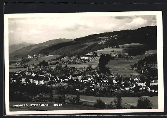 AK Kindberg /Steiermark, Ortsansicht vor bewaldeten Bergen