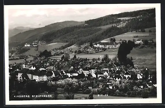 AK Kindberg, Steiermark, Teilansicht vor bewaldeten Bergen