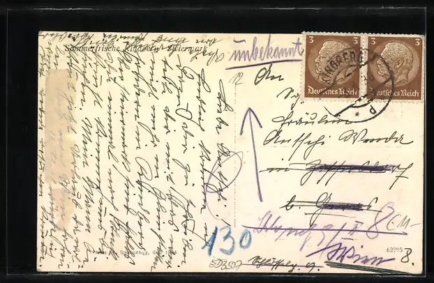 Personenbezogene Daten auf der Rückseite der Karte wurden durch blauen Textmarker unkenntlich gemacht. Die blauen Stellen sind auf die Vorderseite durchgeweicht und wirken sich negativ auf das Postkartenfoto aus