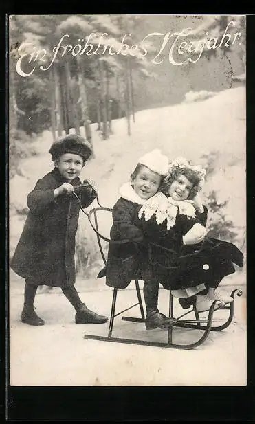 AK Kinder auf Schlitten werden angeschoben, Neujahrsgruss