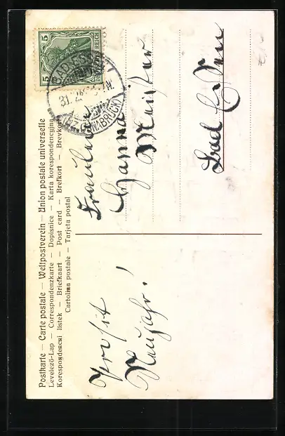 Personenbezogene Daten auf der Rückseite der Karte wurden durch blauen Textmarker unkenntlich gemacht. Die blauen Stellen sind auf die Vorderseite durchgeweicht und wirken sich negativ auf das Postkartenfoto aus
