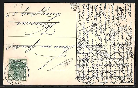 Personenbezogene Daten auf der Rückseite der Karte wurden durch blauen Textmarker unkenntlich gemacht. Die blauen Stellen sind auf die Vorderseite durchgeweicht und wirken sich negativ auf das Postkartenfoto aus
