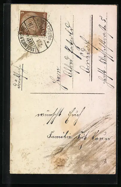 Personenbezogene Daten auf der Rückseite der Karte wurden durch blauen Textmarker unkenntlich gemacht. Die blauen Stellen sind auf die Vorderseite durchgeweicht und wirken sich negativ auf das Postkartenfoto aus
