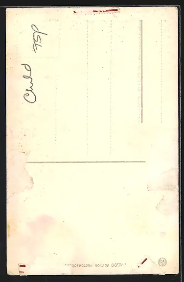 Personenbezogene Daten auf der Rückseite der Karte wurden durch blauen Textmarker unkenntlich gemacht. Die blauen Stellen sind auf die Vorderseite durchgeweicht und wirken sich negativ auf das Postkartenfoto aus